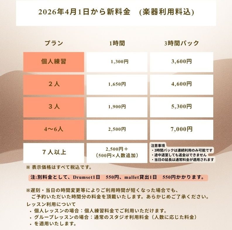 2026年4月よりスタジオ利用料金を改定させていただきます。
